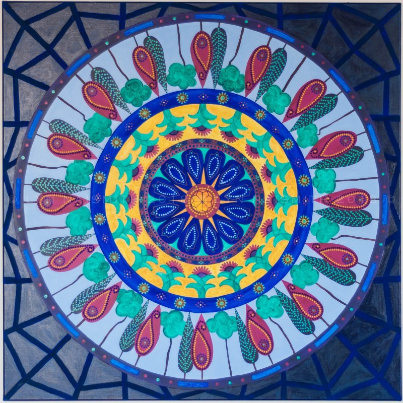 Inspired by a visit to the historic site of Persepolis, Iran, this mandala features stylised floral designs based on the stone carvings from these ancient ruins. Cropped pine trees with their familiar twisted trunks and the rich colours of traditional stained glass windows are bordered by the trellis design of traditional wooden window frames.