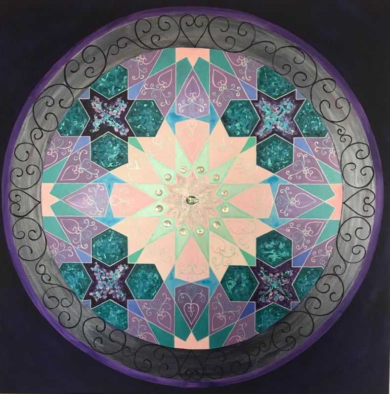 This painting celebrates the pearl [‘Sadaf’ in Arabic]. Pearls have been been prized throughout the ages as a sign of wealth and the pearling industry was a crucial part of Dubai’s history.